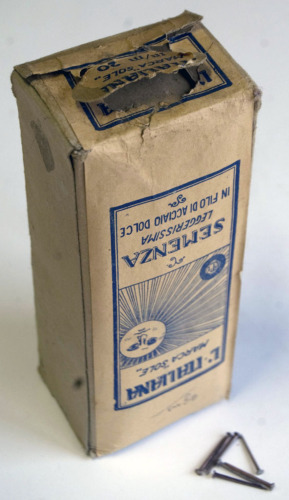 • FUNZIONE E MODALITÀ D'USO contenitore di cartone a base rettangolare; contiene numerose semenze in acciaio, ovvero chiodini utilizzati nella produzione di calzature, in genere per fissare la tomaia o il tacco alla suola