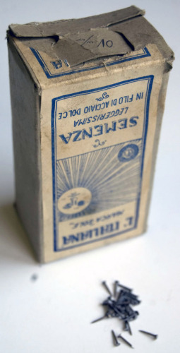 FUNZIONE E MODALITÀ D'USOcontenitore di cartone a base rettangolare; contiene numerose semenze in acciaio, ovvero chiodini utilizzati nella produzione di calzature, in genere per fissare la tomaia o il tacco alla suola