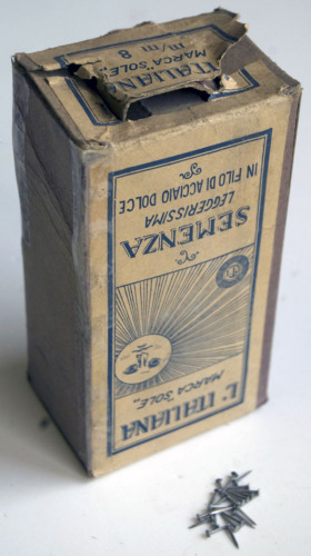 FUNZIONE E MODALITÀ D'USOcontenitore di cartone a base rettangolare; contiene numerose semenze in acciaio, ovvero chiodini utilizzati nella produzione di calzature, in genere per fissare la tomaia o il tacco alla suola