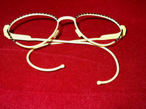 La montatura per bambini è in metallo verniciato in giallo con zigrinature nere nella parte superiore. Le astine terminano a ricciolo. [Descrizione estratta dal database del Museo dell'Occhiale.]