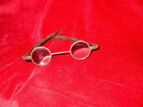 Questo esemplare è in ferro; porta lenti rotonde e stanghette a scorrimento. Singolare il nasello a ponte diritto. [Descrizione estratta dal database del Museo dell'Occhiale.]