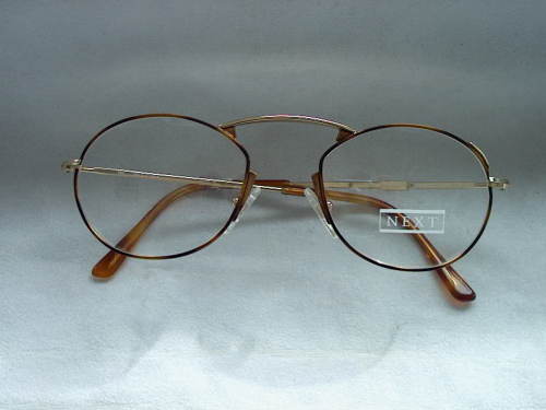 Gli occhiali, in metallo colorato oro ed effetto tartaruga, recano, all'interno dell'astina sinistra: Made in Italy 51 - 21 e di quella destra: 140 Next 404 Il marchio: next è presente inoltre: sulla lente sinistra; sopra l'oculare sinistro ed all'esterno dell'astina sinistra. [Descrizione estratta dal database del Museo dell'Occhiale.]