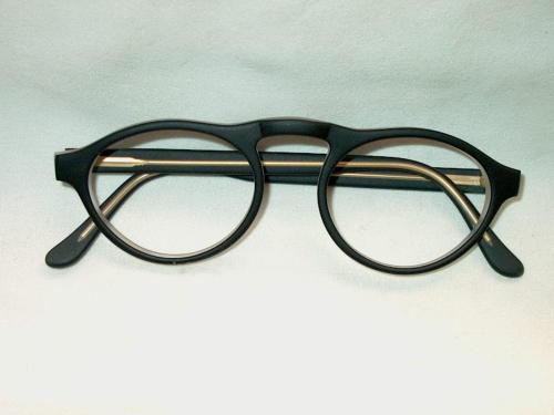 Gli occhiali sono in materiale sintetico colorato nero nella parte anteriore e lasciato trasparente in quella posteriore. [Descrizione estratta dal database del Museo dell'Occhiale.]
