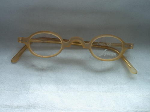 Gli occhiali in plastica leggermente colorata in marroncino, portano lenti piccole e all'interno dell'astina sinistra: Luca CE, e di quella destra: 3674A 36-29. Sulla lente sinistra: Luca. [Descrizione estratta dal database del Museo dell'Occhiale.]