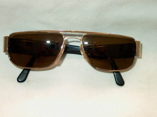Gli occhiali sono in metallo colorato oro ed astine in materiale sintetico colorato nero. Le lenti sono colorate marroncino. [Descrizione estratta dal database del Museo dell'Occhiale.]