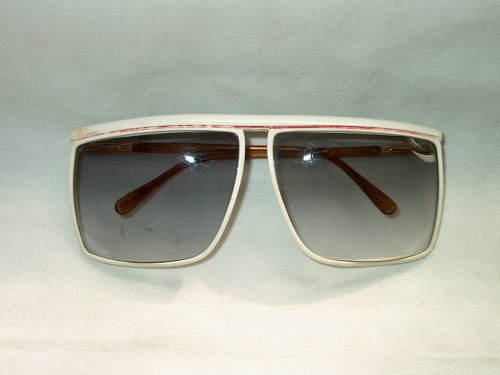 Gli occhiali hanno la mascherina in materiale sintetico bianco e le astine in metallo ricoperto da plastica colorata marroncino. Le lenti sono colorate in grigio. [Descrizione estratta dal database del Museo dell'Occhiale.]