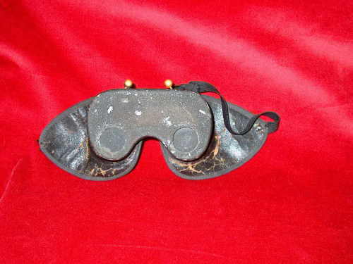 Questi occhiali, pensati come cappuccio per impedire la visione, servivano per i nuovi affilliati alle confraternite. Gli oculari sono ostruiti da vetri rossi o lamine nere: vengono liberati per mezzo di pippiolini posti alla sommità della mascherina. Sono in cuoio e acciaio protetto da panno nero. [Descrizione estratta dal database del Museo dell'Occhiale.]