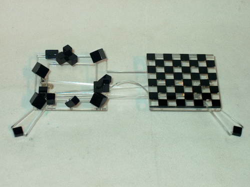 Questi occhiali sono stati realizzati per l'esposizione "Marcel Duchamp" tenutasi a Venezia aPalazzo Grassi - 1993, dalla Ditta "Nel Giardino del Tempo". Occhiali in plexiglass trasparente e colorato. Disegno e progetto: Marisa Camillo. Esecuzione: Jean Jacques Zunino. Titolo: Scacco Matto [Descrizione estratta dal database del Museo dell'Occhiale.]