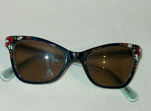Questa montatura è in celluloide bicolore (nero - verdino) e negli angoli di attaccatura della mascherina alle astine sono disegnati fiori e foglie a smalto. [Descrizione estratta dal database del Museo dell'Occhiale.]