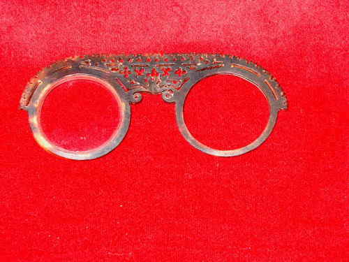 Esemplare in tartaruga bruna, opera dei maestri di Norimberga e di fattura eccezionale. Il ponte è completamente traforato con trifogli, quadrifogli, mentre l'esterno è contornato da piccolissime torri. Manca una lente. [Descrizione estratta dal database del Museo dell'Occhiale.]
