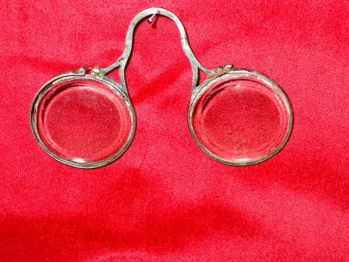Occhiali in argento, con lenti graduate e ponte sagomato con attaccatura sui cerchi con due attaccature per parte. [Descrizione estratta dal database del Museo dell'Occhiale.]