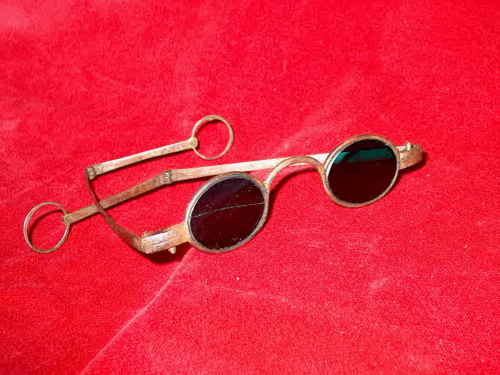 Gli occhiali in ferro montano delle lenti ovali verdi; hanno il nasello a "C" e le stanghette ripiegabili terminano con degli anelli. La lente di destra è rotta diagonalmente. [Descrizione estratta dal database del Museo dell'Occhiale.]