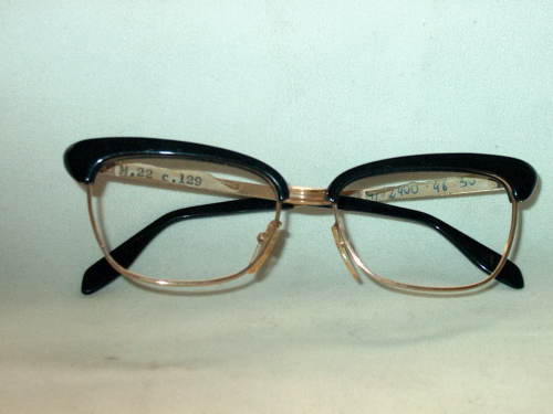Gli occhiali hanno gli oculari e le astine in metallo colorato oro mentre la mascherina ed i terminali sono in materiale sinttico nero. All'interno dell'astina sinistra: 1/8 2400 46-50. All'interno dell'astina destra: M.22 C.129. [Descrizione estratta dal database del Museo dell'Occhiale.]
