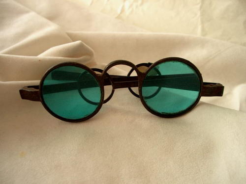 Gli occhiali, in ferro, hanno le astine ripiegabili e montano delle lenti rotonde colorate in verdino. [Descrizione estratta dal database del Museo dell'Occhiale.]