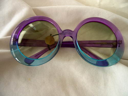 Gli occhiali da sole sono in materiale sintetico colorato viola - azzurro e montano lenti colorate in verde con tonalità a decrescere. Recano punzoni sull'astina sinistra e sull'astina destra. [Descrizione estratta dal database del Museo dell'Occhiale.]