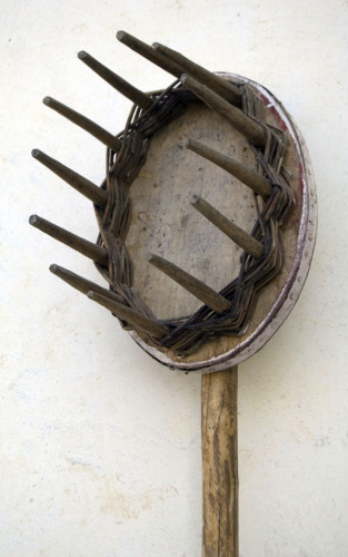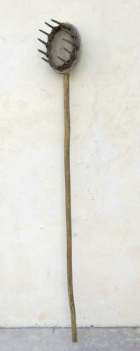 attrezzo costituito da una lunga pertica in legno di nocciolo, munita ad una estremità di un piccolo canestro a sezione ovale, costituito da una base in legno di tiglio lungo il cui perimetro sono infilati rebbi appuntiti in legno di acacia, attorno ai quali, nella parte inferiore, sono intrecciati rametti di salice