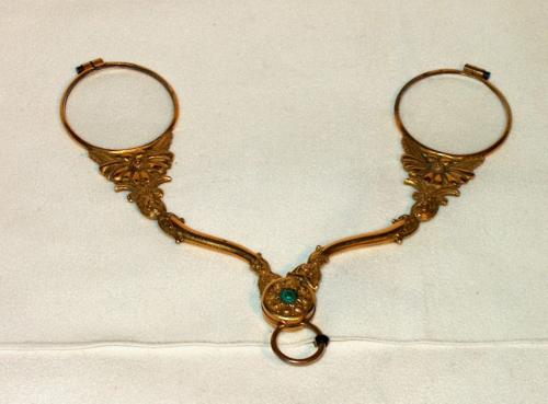 Fassamano (occhiale a forbice) in ottone dorato con impugnatura incisa a motivi floreali. [Descrizione estratta dal database del Museo dell'Occhiale.]