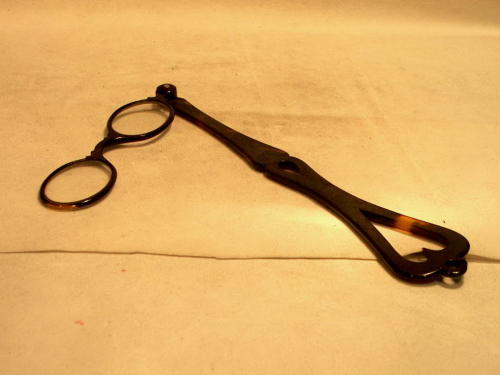 Fassamano del tipo a manico lungo, in tartaruga; manico mobile sagomato, con due fori decorativi: uno più piccolo al centro a forma di goccia e uno grande all'estremità inf. a forma di cuore. Leti ovali in vetro. [La descrizione inserita nel database del Museo dell'Occhiale non è corretta.]