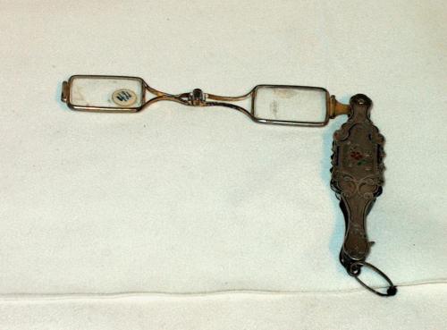 Fassamano in argento montato a ciondolo e terminante con un anello in modo da poterlo agganciare ad una collana. L'impugnatura funge da astuccio quando l'occhiale non viene usato e, in questo caso, è realizzata in argento inciso a motivi fantasiosi. Fiorellini e modanature in smalto. [Descrizione estratta dal database del Museo dell'Occhiale.]