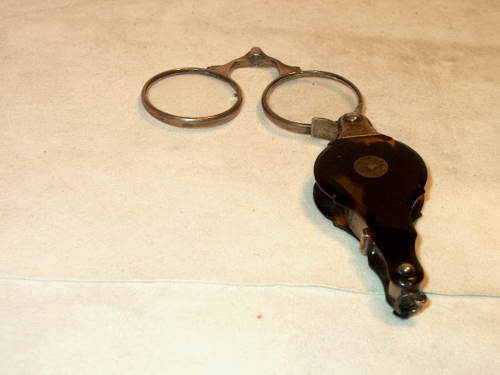 Fassamano a forbice con impugnatura in tartaruga e occhiale in argento. L'astuccio-impugnatura funge da custodia quando l'occhiale non viene usato, i supporti sono ondulati e la sua forma segue esattamente quella dell'occhiale quando è chiuso. [Descrizione estratta dal database del Museo dell'Occhiale.]