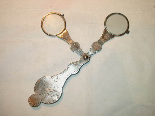 Fassamano in argento con astuccio-impugnatura sempre in argento, inciso a motivi stile impero e con le iniziali R.J. da un verso e dall'altro un composizione contornata di foglie che reca una falce ed una faretra. (appartenuto a Jeanne Robini, madre del celebre tenore 1795/1854). [Descrizione estratta dal database del Museo dell'Occhiale.]