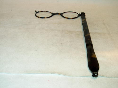 Fassamano in tartaruga a impugnatura lunga. L'occhiale può essere ripiegato e inserito nel centro del manico che normalemente è molto lungo ed è a goccia. Questo tipo di fassamano venne impiegato dalla metà del 1800 sino al 1920 circa. [Descrizione estratta dal database del Museo dell'Occhiale.]