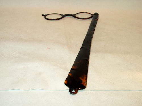 Fassamano in tartaruga a impugnatura lunga. L'occhiale può essere ripiegato e inserito nel centro del manico che normalmente è molto lungo ed è a goccia. Questo tipo di fassamano venne impiegato dalla metà del 1800 sino al 1920 circa. [Descrizione estratta dal database del Museo dell'Occhiale.]