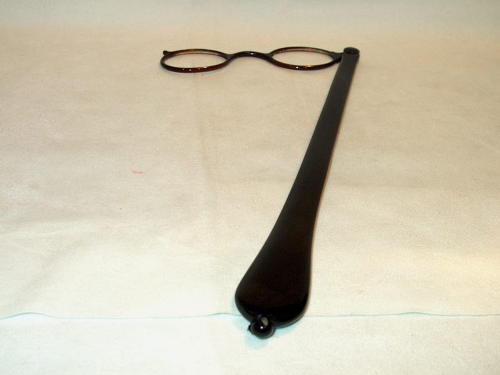 Fassamano in tartaruga a impugnatura lunga. L'occhiale può essere ripiegato e inserito nel centro del manico che normalmente è molto lungo ed è a goccia. Questo tipo di fassamano venne impiegato dalla metà del 1800 sino al 1920 circa. [Descrizione estratta dal database del Museo dell'Occhiale.]