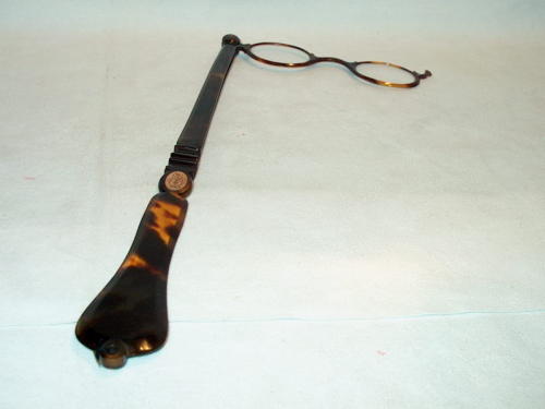 Fassamano in tartaruga a impugnatura lunga. L'occhiale può essere ripiegato e inserito nel centro del manico che normalmente è molto lungo ed è a goccia. Al centro del manico placchetta ovale in oro con le iniziali "M.L.". Questo tipo di fassamano venne impiegato dalla metà del 1800 sino al 1920 circa. [Descrizione estratta dal database del Museo dell'Occhiale.]