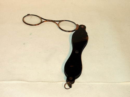 Fassamano in argento dorato con astuccio-impugnatura sagomato come l'occhiale, in tartaruga. [Descrizione estratta dal database del Museo dell'Occhiale.]