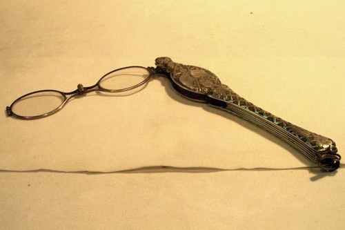 Fassamano in argento con impugnatura lunga incisa a motivi agresti. Su una facccia: tre fiori, foglie, una rete e medaglione con "AB". Sull'altra faccia: due fiori, foglie, una rete, un fascio di fieno, forca, rastrello e zucca per l'acqua. [Descrizione estratta dal database del Museo dell'Occhiale.]