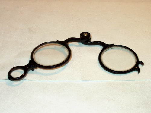 Fassamano (occhiale a forbice) in corno, di fattura molto semplice con l'impugnatura ad anello fissata alla lente destra. [Descrizione estratta dal database del Museo dell'Occhiale.]