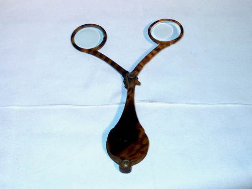 Fassamano (occhiale a forbice) con astuccio-impugnatura a forma di pera allungata. Sia le lenti sia l'impugnatura sono in corno chiaro ad effetto tartaruga. [Descrizione estratta dal database del Museo dell'Occhiale.]