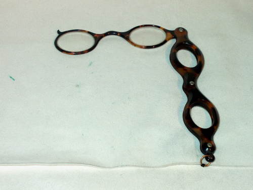 Fassamano in tartaruga con astuccio-impugnatura sagomato con la forma dell'occhiale. Al centro dell'impugnatura ci sono due aperture ovali in corrispondenza delle lenti che permettono l'utilizzo dell'occhiale senza rimuoverlo dalla protezione. [Descrizione estratta dal database del Museo dell'Occhiale.]