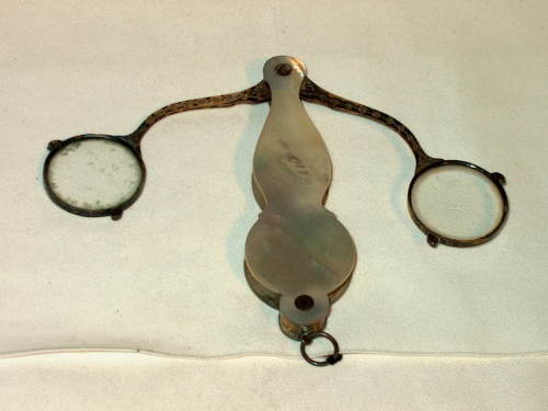 Fassamano a forbice con impugnatura in madreperla e occhiale in argento. L'astuccio-impugnatura funge da custodia quando l'occhiale non viene usato, i supporti sono ondulati e la sua forma segue esattamente quella dell'occhiale quando è chiuso. Sulle astine che portano le lenti (in argento dorato) è presente una serie di impressioni su ambedue i lati. [Descrizione estratta dal database del Museo dell'Occhiale.]