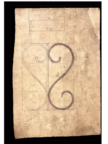 Foglio con due disegni: al centro in grande sono tracciati i profili di due volute ad 'esse' inscritte in un rettangolo diviso a metà in senso verticale. Della voluta di sinistra sono stati tracciati soltanto i bordi, quella di destra ha l'interno pieno. A metà del rettangolo di destra e a 1/3 di quello di sinistra sono state tracciate due linee orizzontali; la linea di destra riporta la cifra 47. Il lato destro e la parte inferiore del foglio sono state usate per eseguire dei calcoli. Sulla parte superiore del foglio è stato tracciato un rettangolo, a sviluppo orizzontale rispetto all'asse verticale delle volute; il rettangolo è diviso a metà da una linea al suo interno, lungo le linee sono riportate delle misure. Il bordo di sinistra del foglio è frastagliato in quanto si tratta del lato lungo il quale il foglio è stato strappato e staccato presumibilmente da un foglio di dimensioni più grandi. Sul retro del foglio è riportato il disegno per la realizzazione di un marchio.