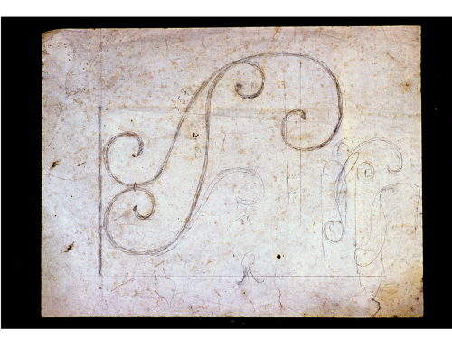 Foglio a sviluppo orizzontale con un disegno al centro e vari schizzi disposti sul lato destro e nella parte inferiore destra del foglio. Il disegno si compone di una linea verticale, tracciata sul lato sinistro del foglio, alla quale sono tangenti due volute a 'esse' unite tra loro nei tratti di curva superiore ed inferiore, nel tratto inferiore l'unione si realizza mediante il disegno di un collarino. Sui due tratti centrali delle volute sono riportati rispettivamente i numeri 50 e 57. A lato e sotto il disegno sono stati tracciati, con mano leggera, diversi schizzi di volute, foglie e varie cifre.
