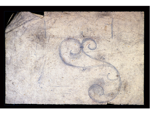 Foglio a sviluppo verticale su cui è stata disegnata una linea verticale, tracciata sul lato sinistro del foglio, alla quale sono tangenti due volute a 'esse' unite tra loro nei tratti di curva superiore ed inferiore; nel tratto inferiore l'unione si realizza mediante un trattino che indica un collarino. Sul lato esterno della linea verticale sono riportati i numeri 18 e 32, sui due tratti centrali delle volute i numeri 38 e 50. Il foglio ha il bordo sinistro inferiore piegato e leggermente strappato. Sul retro del foglio è stato disegnato il profilo di un coltello. Il coltello si compone di un manico, su cui sono stati segnati i due ribattini che lo uniscono alla lama, e di una lama curva. Sul alto a sinistra, sulla parte destra e su quella inferiore del foglio sono stati eseguiti dei calcoli in colonna di cui sono riportate le cifre (si tratta di moltiplicazioni). In basso, con tratto più evidente, è riportata una moltiplicazione in linea.