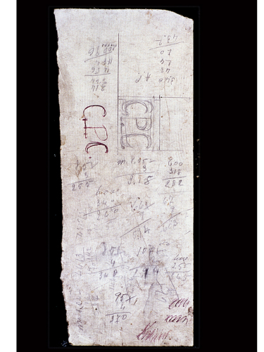 Foglio a sviluppo orizzontale con tracciate, nella parte sinistra, due gruppi di lettere: C. P. C. Un primo gruppo, posto più in alto, è inscritto in un rettangolo e le lettere sono tracciate a mano libera. Il secondo gruppo è tracciato senza linee di riferimento. Sul foglio sono scritte numerose cifre poste in colonna per la realizzazioni di calcoli matematici. Le lettere sono state tracciate sul retro di un pezzo di carta millimetrata.