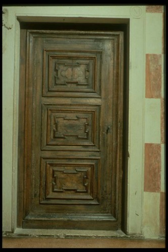 - NOTIZIE STORICO CRITICHE provenienza antiquariale. Le porte, insieme a quella sulla rampa di accesso al palazzo di Ezzelino, sono state ricavate da un unico grande portone dal sig. Cattin, attuale conservatore del castello, all'epoca dell'intervento voluto dal conte Cini.