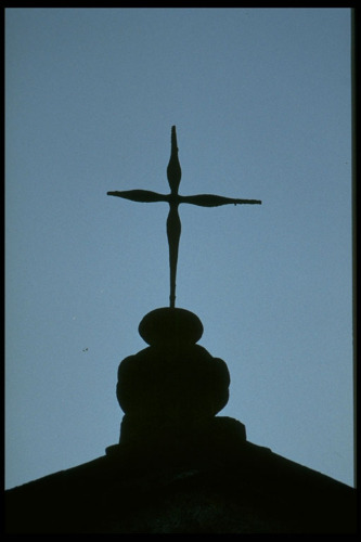 Un piedistallo in pietra a forma di vaso regge la croce in ferro.