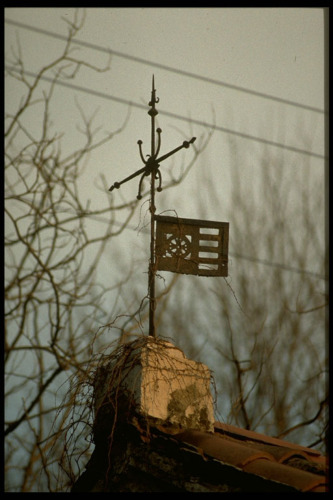 Sopra un basamento in pietra è infissa la croce sul braccio verticale della quale si trova una banderuola segnavento.