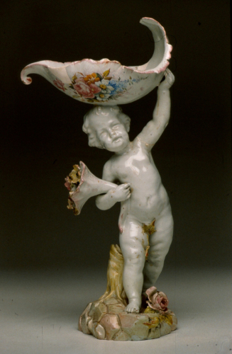statuetta di putto con attributo; decoro policromo