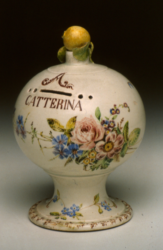 salvadanaio a ventre sferico su ampio piedistallo, punta sulla sommità guarnita da un frutto a tuttotondo; decoro policromo e iscrizione