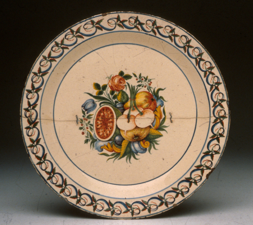 grande piatto rotondo con breve tesa e cavetto poco profondo; decoro policormo