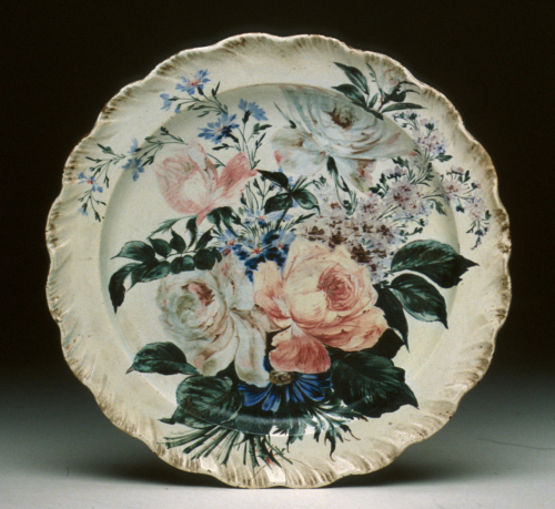piatto rotondo di grandi dimensioni con cavetto poco profondo e breve tesa desinente in un orlo modanato; decoro policromo