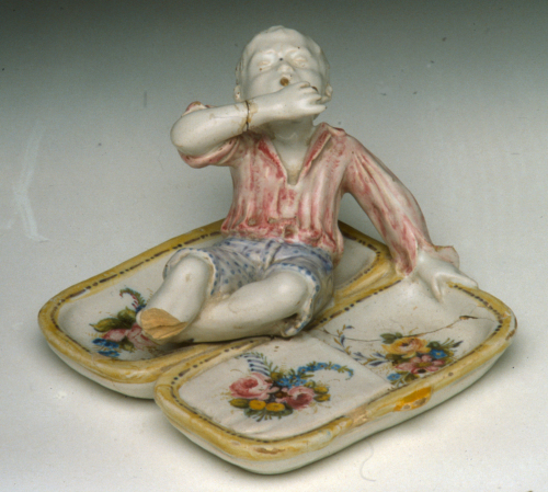 portacenere conformato a bambino seduto su vassoietto bipartito ; decoro policromo