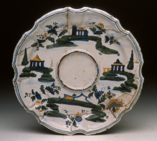 piatto rotondo con tesa a coste e orlo mistilineo, utilizzato come sottotazza; decoro policromo