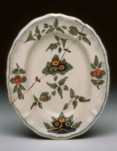 piatto ovale con tesa lievemente centinata; decoro policromo