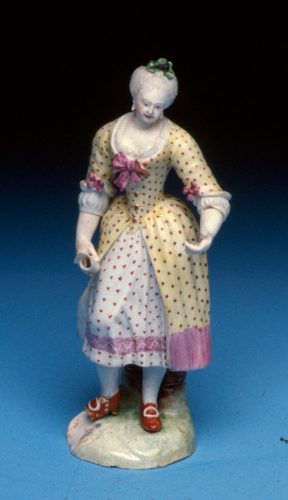 statuetta antropomorfa, policroma, raffigurante una giovane elegantemente vestita